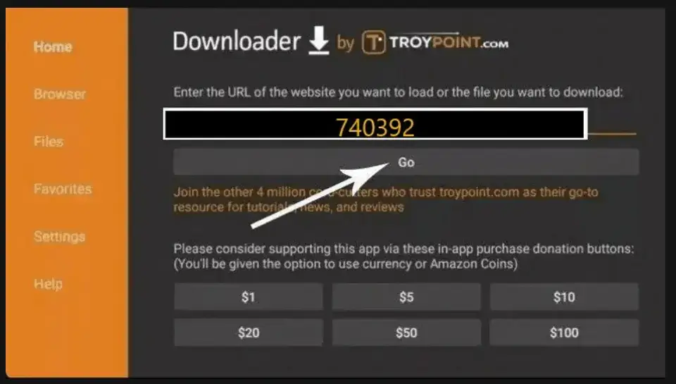 - In Downloader, enter the following CODE: 740392 or IPTV smarters